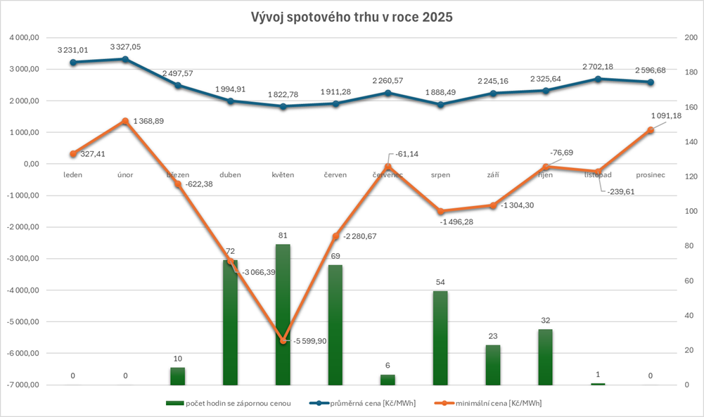 Praha 14. ledna 2026 – Rok 2025 přinesl na spotovém trhu s elektřinou obrat, který by ještě před dvěma lety čekal málokdo. Po dramatickém propadu cen po energetické krizi v roce 2022 se totiž ceny znovu vydaly nahoru, a to i přesto, že se na trhu objevilo 348 hodin se zápornou cenou elektřiny. Data navíc ukazují, že se stávají běžnou součástí trhu, aniž by samy o sobě znamenaly další plošné zlevňování.